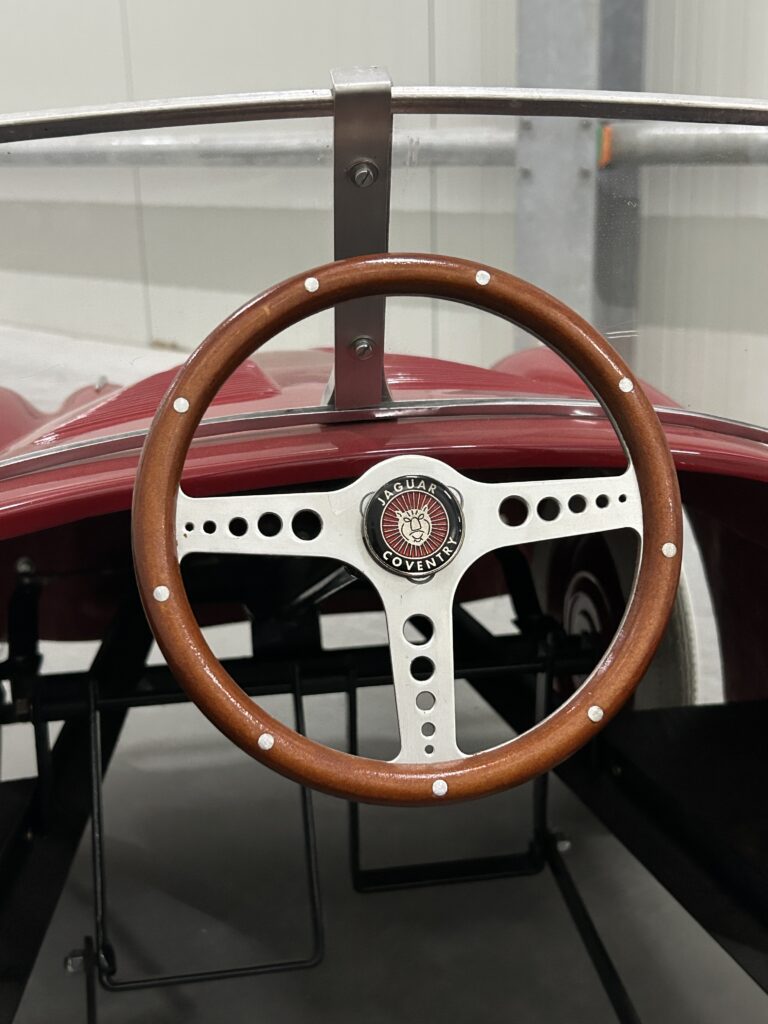 Fitted with a classic steering wheel and upholstered in beautiful ‘tuck and roll’ vinyl, this pedal car exudes vintage charm. It features chrome trim, signal lights, and white tyres on red wheels with period-correct Jaguar hubcaps. The brightwork all around adds a touch of elegance and character.