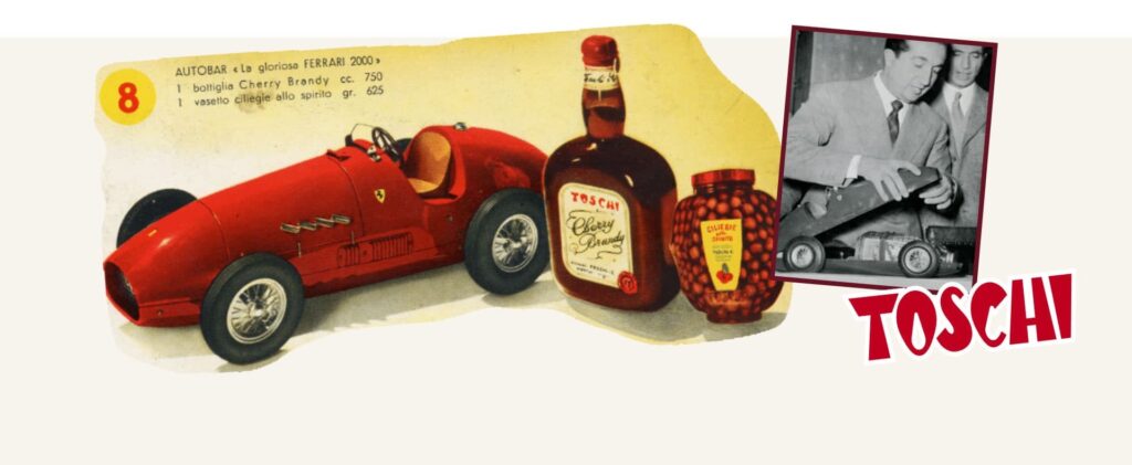 A Rare Piece of Italian Charm. A remarkable large-scale (1/6) model of the legendary Ferrari 500 Grand Prix Monoposto, crafted by Toschi in Italy around 1952. Originally created as a presentation gift for Ferrari team members and selected dealers. The model is finely detailed, featuring rubber tires on metal spoked wheels and a removable upper body that once concealed a bottle of cherry liqueur. When removed, it could be converted into a toy car powered by a rubber-band drive. A rare collectible measuring 53 cm in length, boasting beautiful patina and authentic character.
